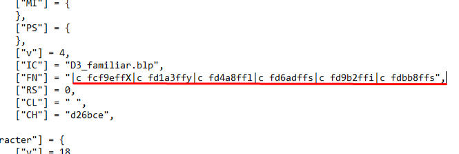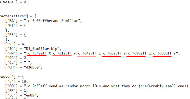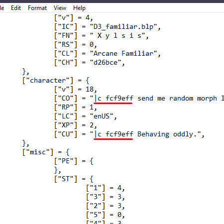 From here, locate your character's name ["FN"], Currently ["CU"], OOC info ["CO"], etc. Whatever you want to color.