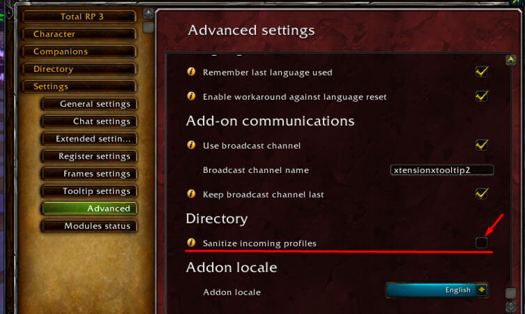 If you do not uncheck this, all TRP3 profiles will be wiped after tampering.(This option might be outdate for SL)